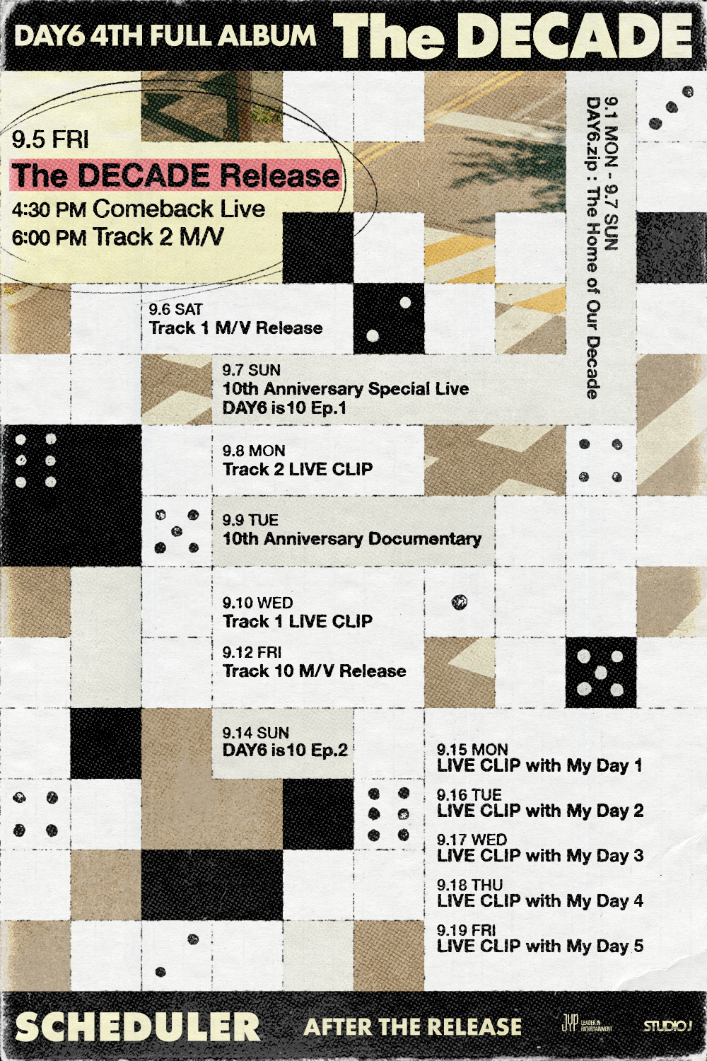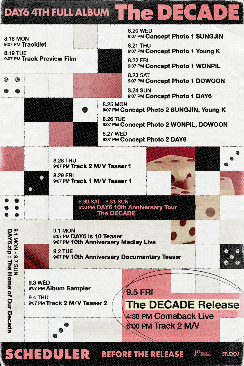 DAY6는 9월 5일 네 번째 정규 앨범 'The DECADE'(더 데케이드)를 발표한다. JYP엔터테인먼트는 8월 14일 오후 그룹 공식 SNS 채널에 새 앨범 티저 일정과 데뷔 10주년 기념 프로젝트가 담긴 스케줄러를 공개하고 기대감을 더했다.