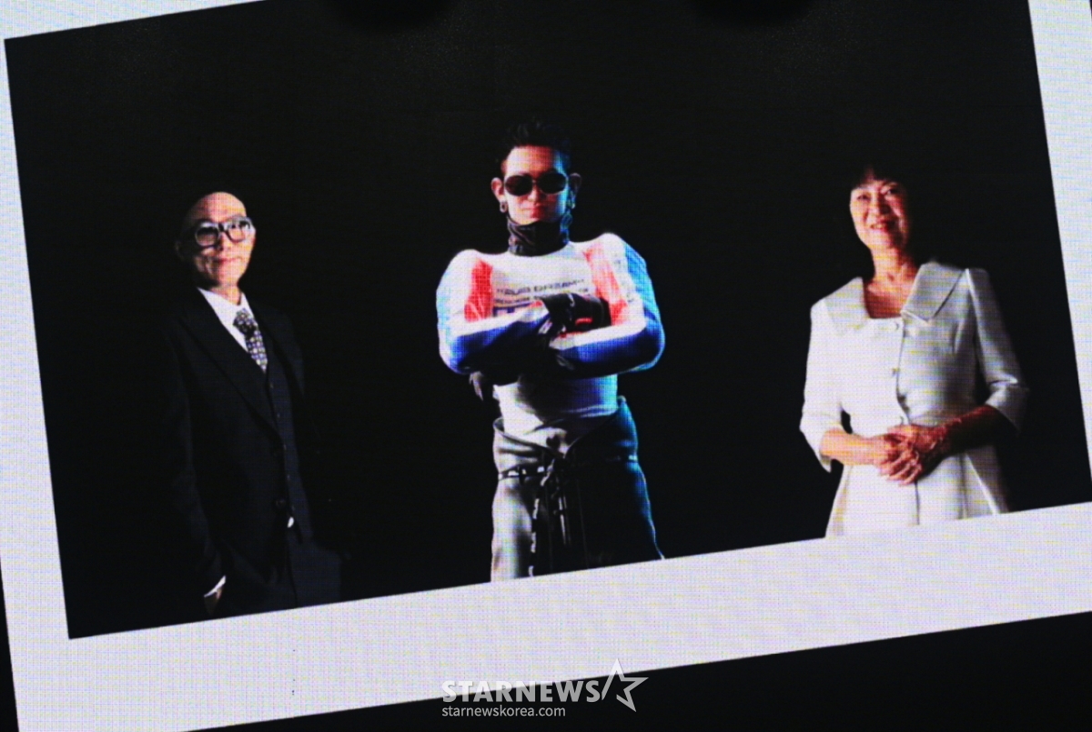 그룹 듀스의 멤버 고(故) 김성재 아바타 기자간담회가 2022년 9월 7일 서울 마포구 구름아래소극장에서 열린 가운데 고인의 동생 김성욱, 모친 육미영 씨가 아바타와 포즈를 취하고 있다. /사진제공=갤럭시 코퍼레이션