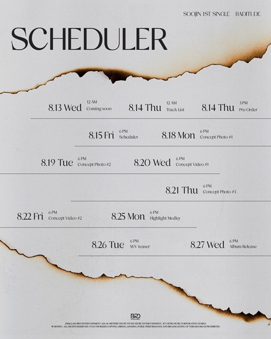 소속사 BRD엔터테인먼트는 지난 15일 수진의 공식 SNS 채널에 첫 싱글 'BADITUDE'('배디튜드')의 스케줄러를 오픈했다.