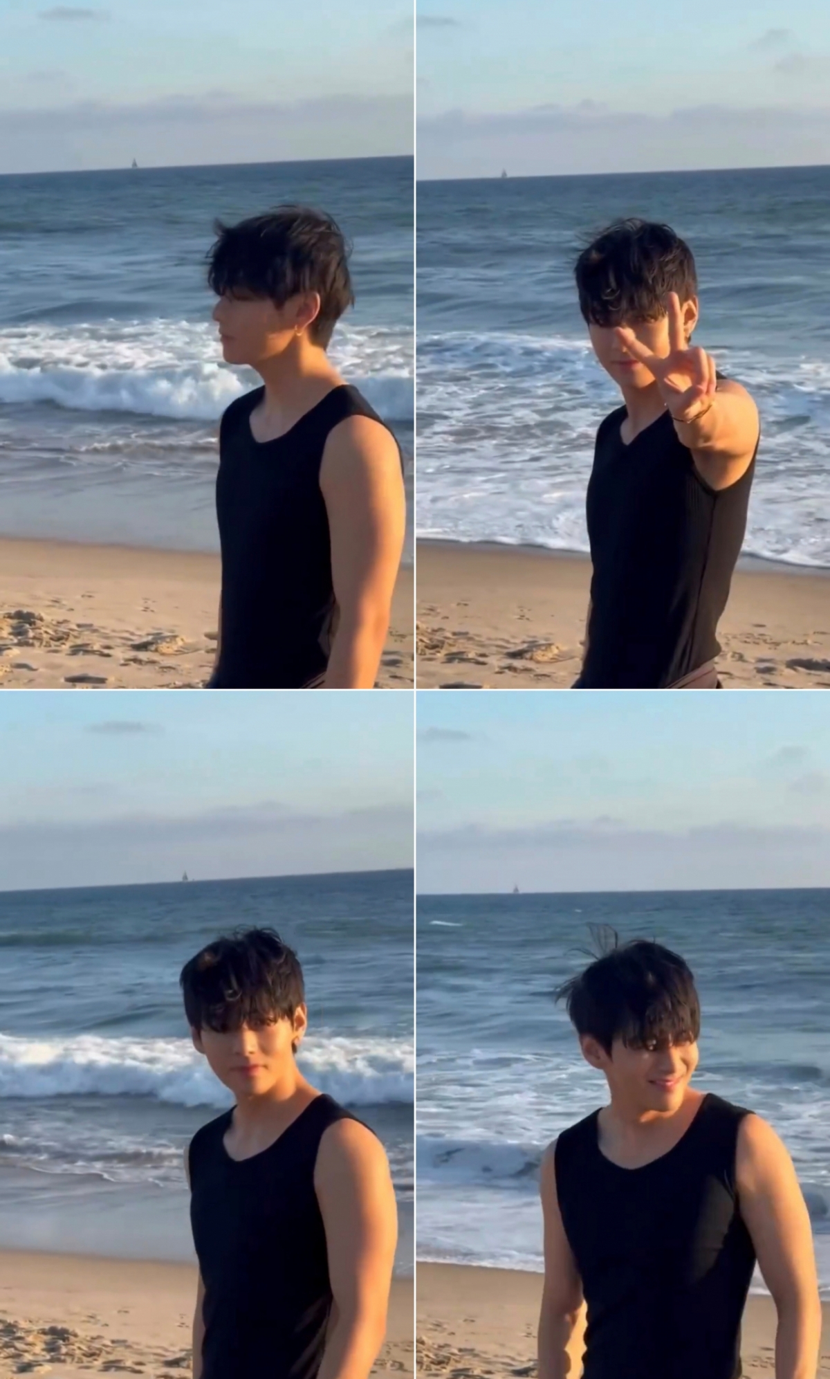 여름의 바닷가에서 활짝 웃으며 브이를 하고 있는 뷔의 모습은 청춘 그 자체로 마치 한 편의 영화를 보는 듯 아련함과 설렘을 안겼다.