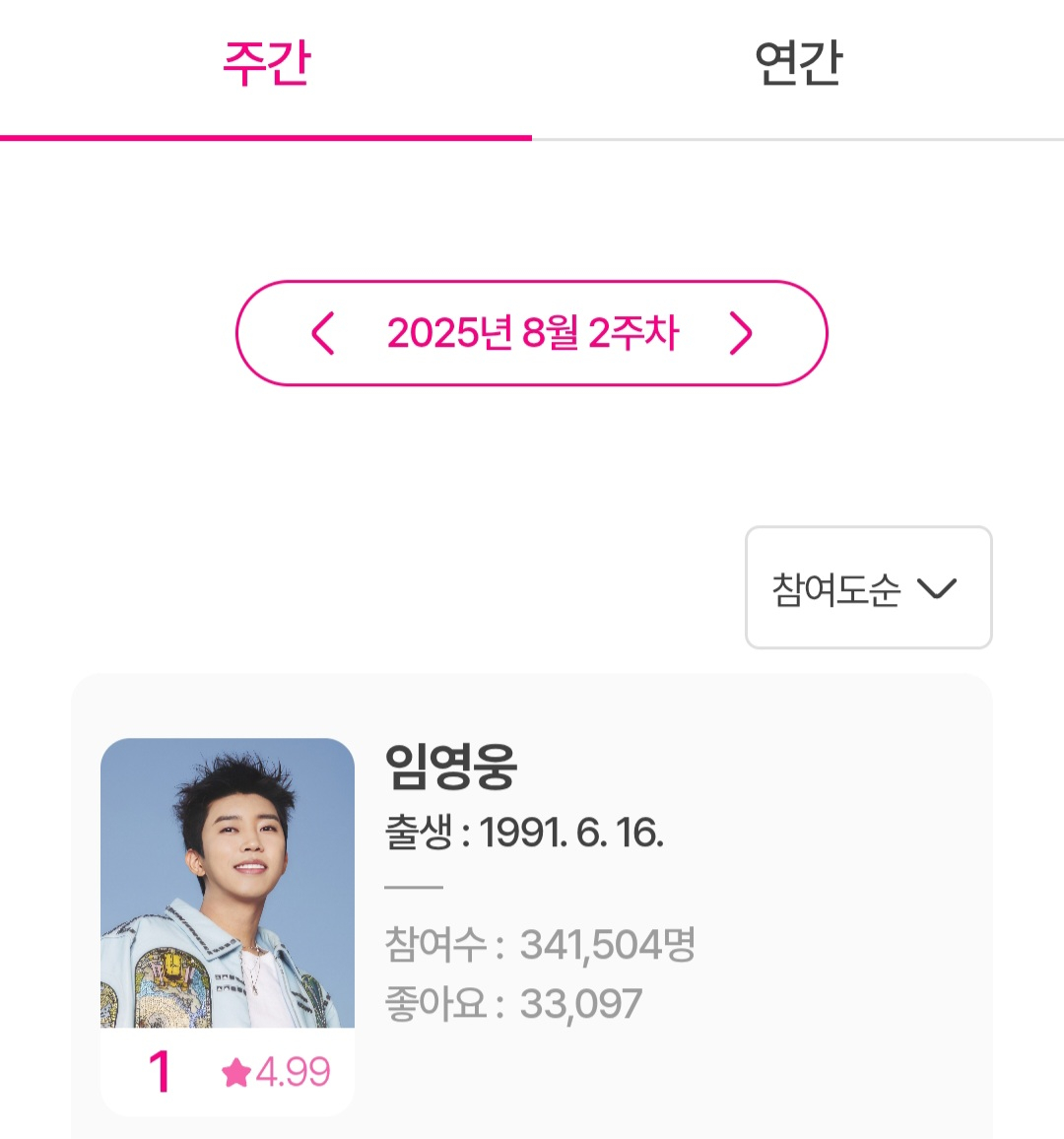 임영웅은 8월 11일부터 8월 17일까지 집계된 8월 2주차 아이돌차트 평점랭킹에서 34만 1504표를 얻어 1위를 차지했다.