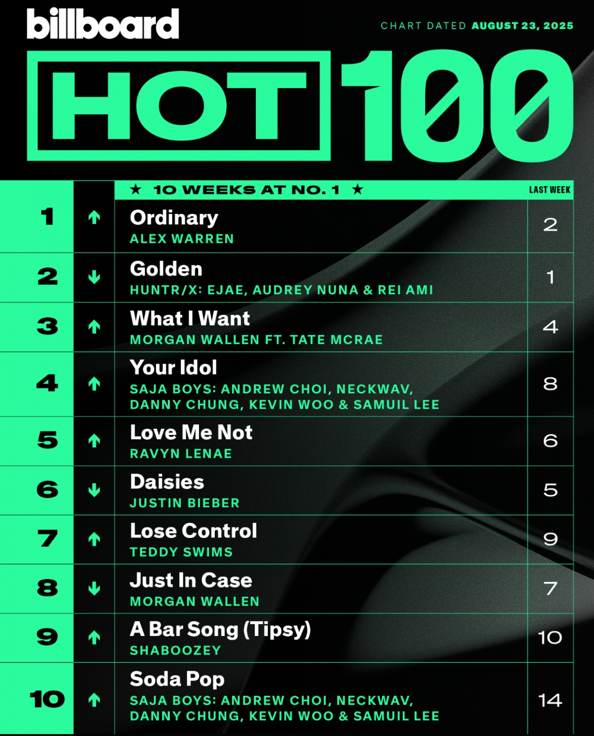 앞서 빌보드는 11일 '골든'이 핫100 차트 정상에 올랐다고 밝혔다. '골든'은 알렉스 워렌의 '오디너리'(Ordinary)를 꺾고 1위를 차지했다.