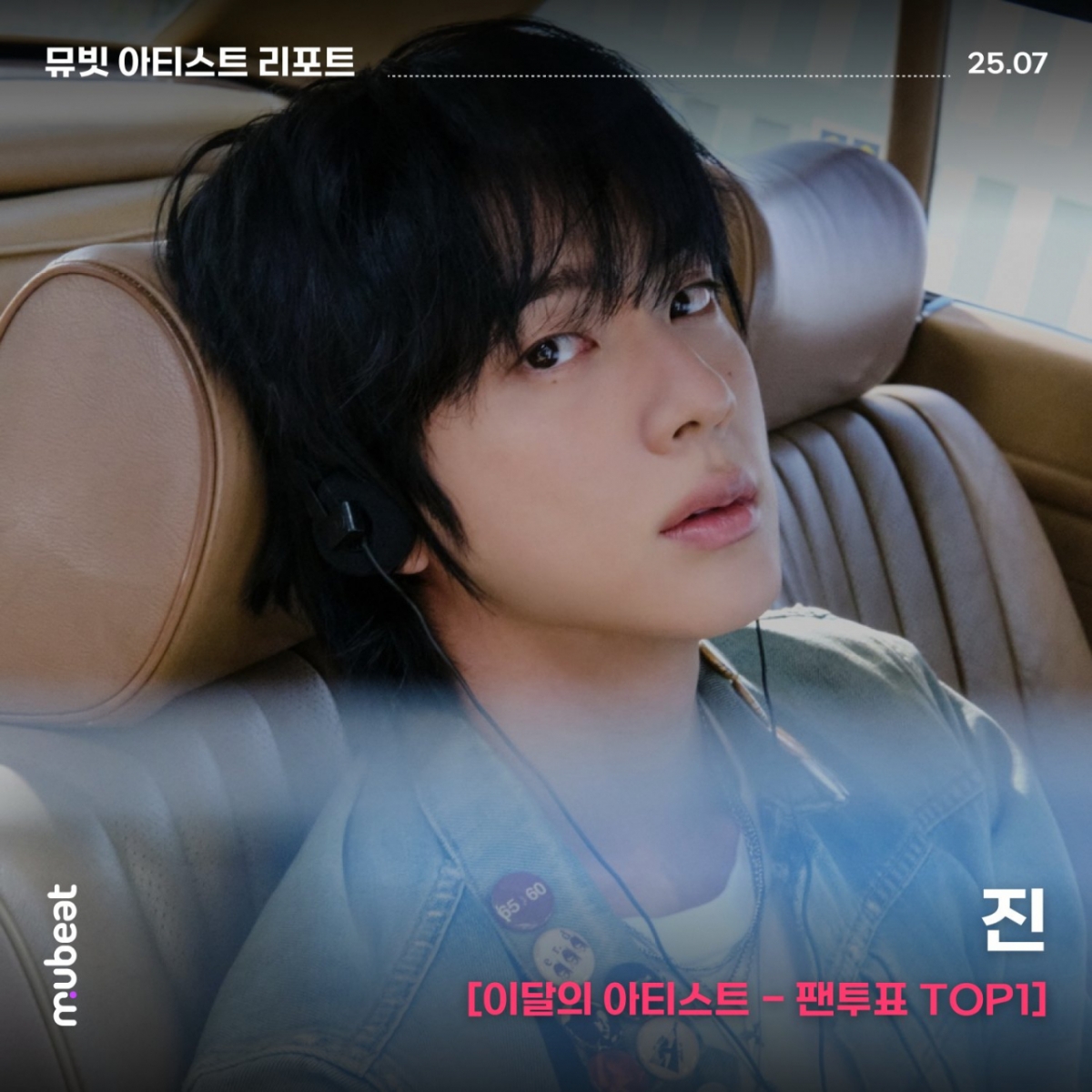 진은 글로벌 K-POP 팬덤 플랫폼 뮤빗(mubeat)에서 발행하는 뮤빗 아티스트 리포트에서 '팬투표 부문' 1위로 7월 이달의 아티스트에 선정됐다.