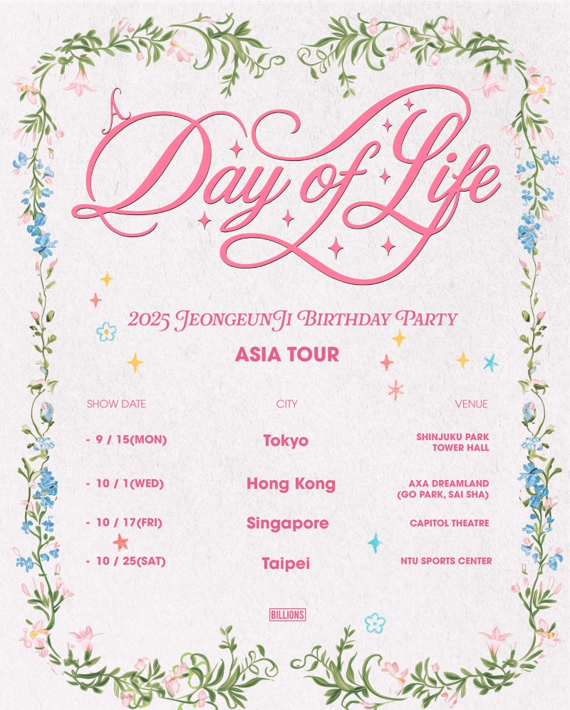 소속사 빌리언스는 지난 20일 오후 6시 공식 SNS를 통해 '2025 정은지 버스데이 파티 '어 데이 오브 라이프'(2025 JEONG EUNJI Birthday Party 'A Day Of Life')' 아시아 투어 일정이 담긴 포스터를 공개하고 싱가포르 공연 추가 소식을 알렸다.