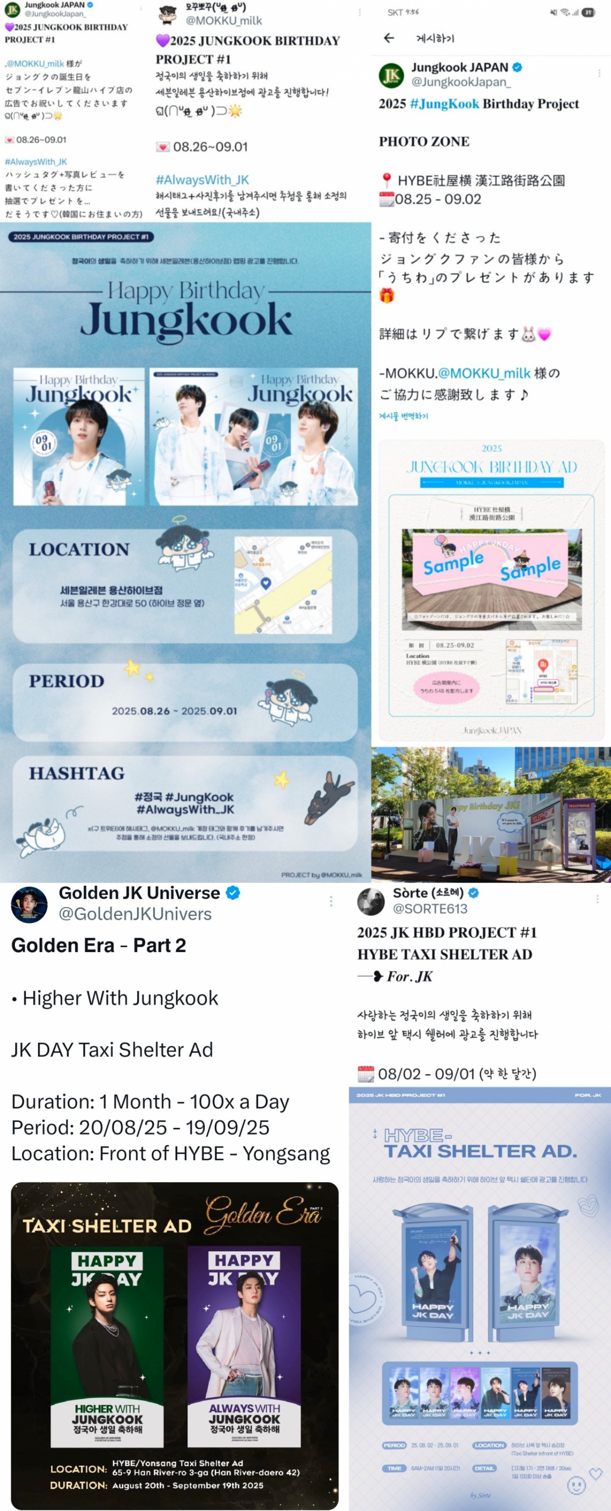 정국의 해외 팬베이스 '골든 JK 유니버스'(Golden JK Univers)는 8월 2일~9월 1일까지 하이브 사옥 바로 앞 택시 승강장에서 생일 축하 광고를 한다.