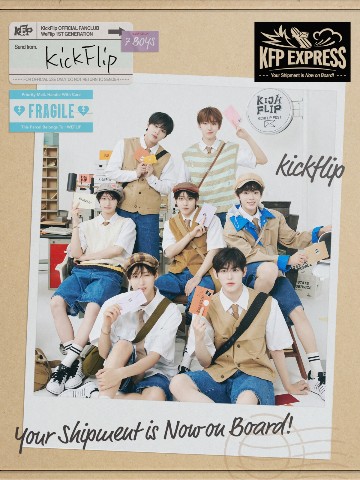 JYP엔터테인먼트는 20일 오후 1시 20분 킥플립 공식 SNS 채널에 공식 팬클럽 위플립(WeFlip) 1기 커밍순 티저 포스터와 영상을 공개했다. 킥플립 데뷔 날짜 1월 20일에 맞춰 오후 1시 20분에 오픈된 이번 콘텐츠에는 킥플립 특유의 자유로운 분위기와 개성이 드러났다. 계훈, 아마루, 동화, 주왕, 민제, 케이주, 동현이 스케이트보드를 타고 위플립에게 첫 번째 러브레터를 전하는 세상에서 제일 힙한 우체부로 변신한 것. '킥플립 우체국' 콘셉트 속 우편물 수거, 우표 부착, 실링 왁스 찍기 등 각자 역할을 맡은 일곱 멤버는 개구진 미소와 훈훈한 비주얼로 팬심을 끌어당겼다.