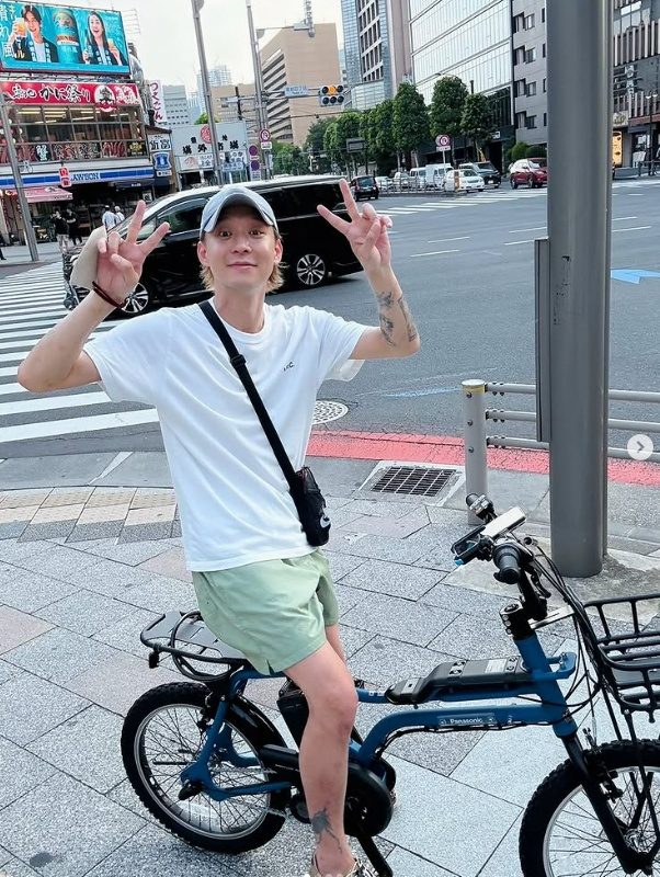 사진 속에는 박유천이 자전거를 타고 일본 거리를 누비는 모습이 있었다. 그는 카메라를 향해 브이 자 포즈를 취하며 신난 미소를 지어보였다.