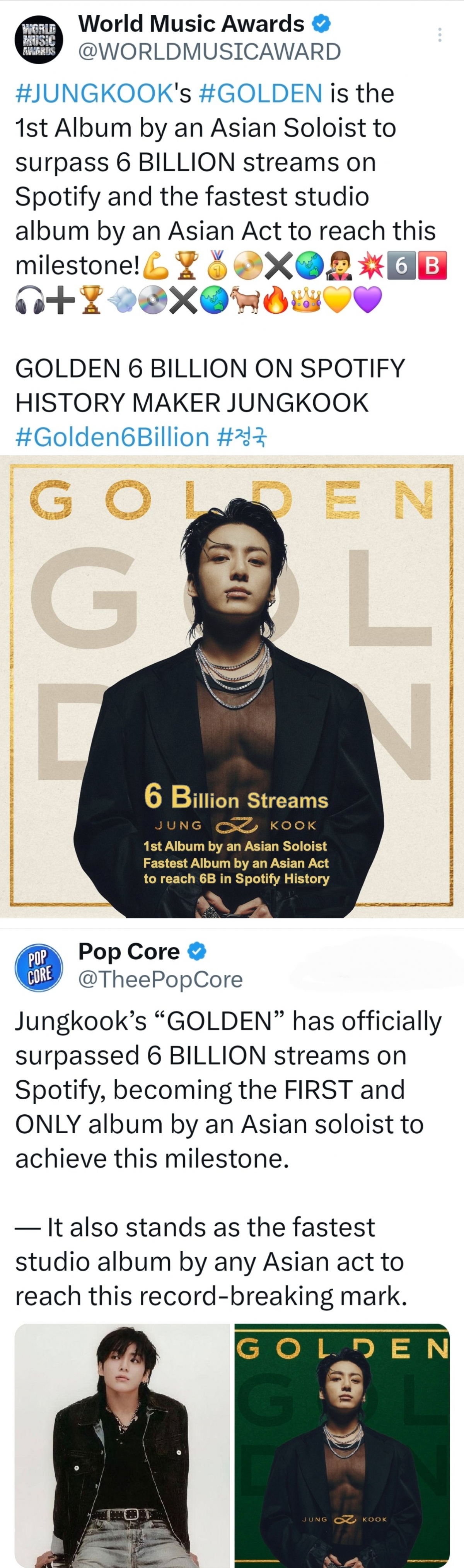 '월드뮤직어워드'(WMA), '팝 코어'(Pop Core) 등 공식 계정에 따르면, 'GOLDEN'은 역대 아시아 아티스트 정규 앨범( Studio Album) 가운데 최단 기간, 아시아 솔로 아티스트 앨범 최초로 60억을 달성하는 신기록을 세웠다.