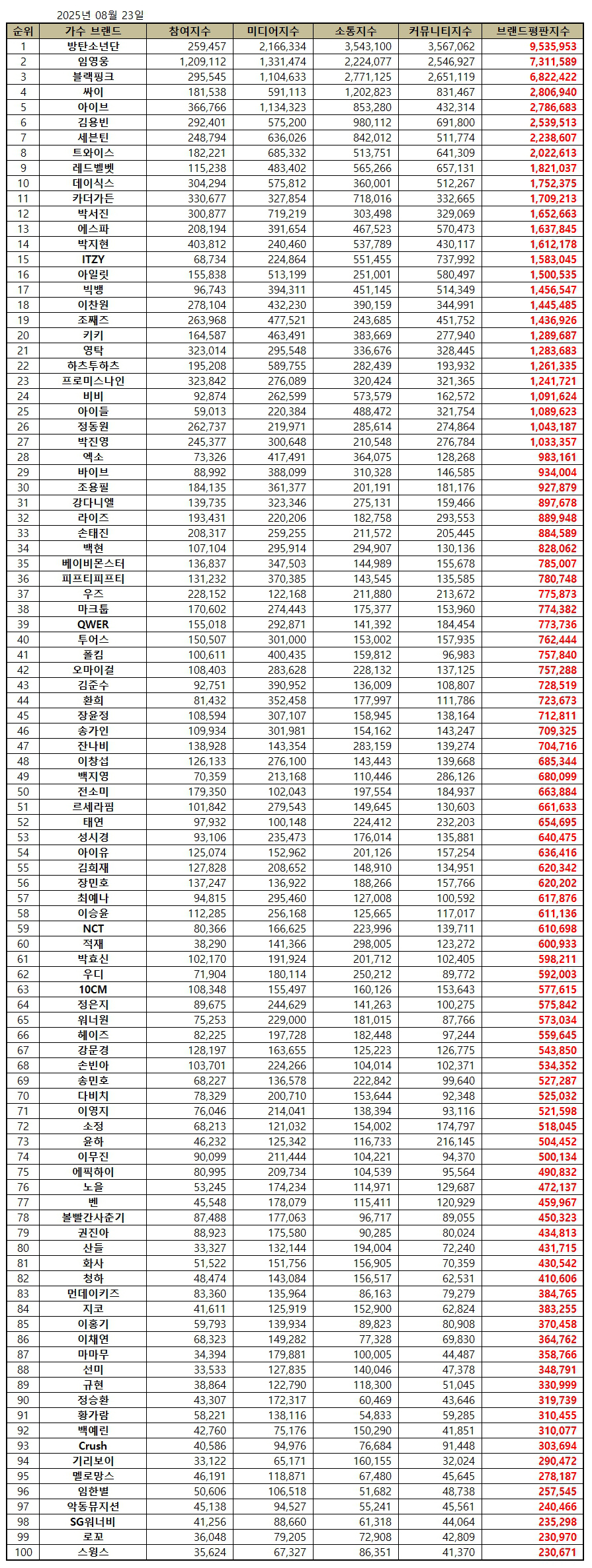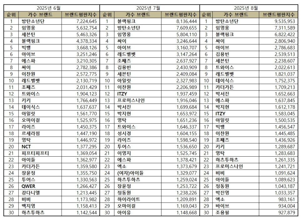 2025년 8월 가수 브랜드평판 30위 순위는 방탄소년단, 임영웅, 블랙핑크, 싸이, 아이브, 김용빈, 세븐틴, 트와이스, 레드벨벳, 데이식스, 카더가든, 박서진, 에스파, 박지현, ITZY, 아일릿, 빅뱅, 이찬원, 조째즈, 키키, 영탁, 하츠투하츠, 프로미스나인, 비비, 아이들, 정동원, 박진영, 엑소, 바이브, 조용필 순으로 분석됐다.