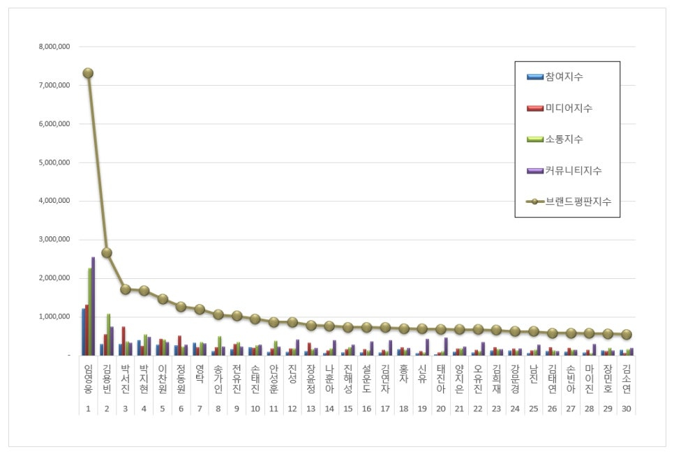 트로트 가수 브랜드평판 1위를 기록한 임영웅 브랜드는 참여지수 1,205,574 미디어지수 1,307,555 소통지수 2,257,760 커뮤니티지수 2,546,396이 되면서 브랜드평판지수 7,317,285로 분석됐다. 지난 7월 브랜드평판지수 5,895,866과 비교해보면 24.11% 상승했다.
