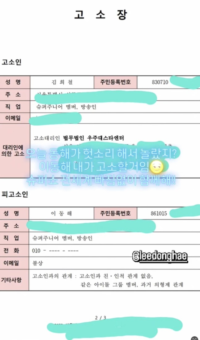 지난 23일 김희철은 "오늘 동해가 헛소리 해서 놀랐지? 이동해 내가 고소할 거임. 슈퍼쇼 전 세계 빠짐 없이 함께해!"라며 고소장 사진을 게재했다.