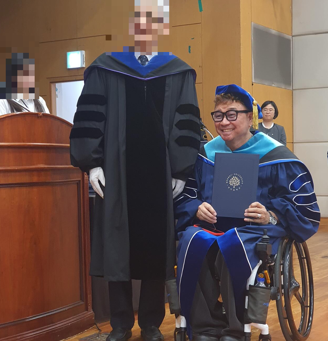사진 속 강원래는 졸업 가운을 입은 채 휠체어에 앉아 미소를 지으며 학위기를 받고 있다.