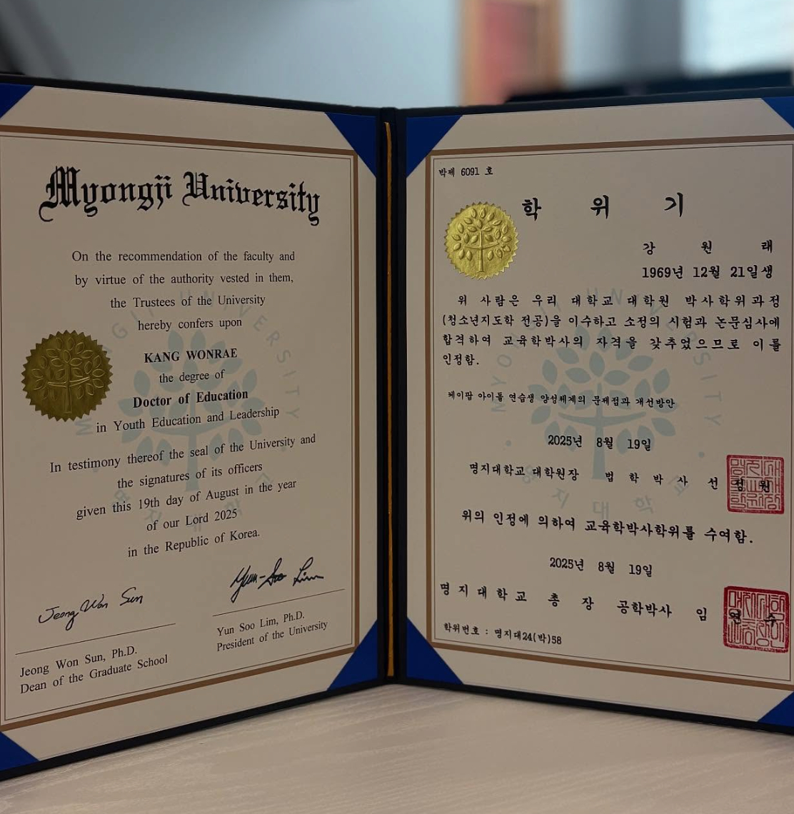 이로써 강원래는 지난 2015년 디지털서울문화예술대 학사 과정, 2020년 명지대학교 일반대학원 교육학 석사 학위 취득에 이어 5년 만에 박사 학위를 받게 됐다.