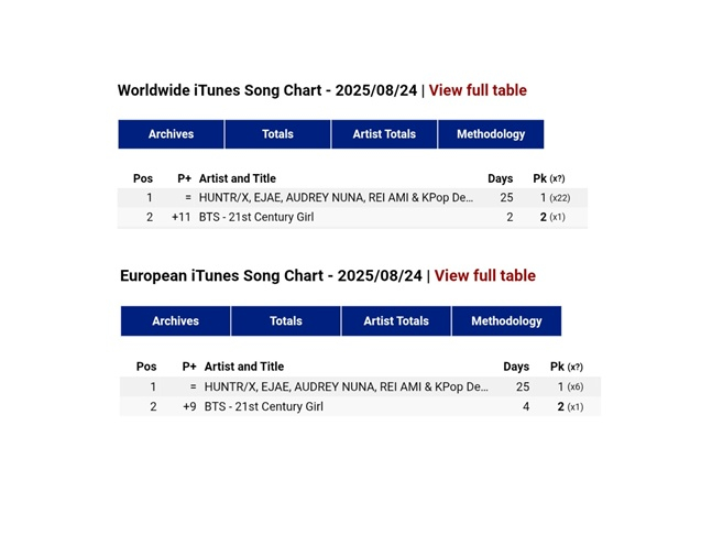 25일(현지시간) BTS의 '21st Century Girl'이 미국 아이튠즈 24일 차트에서 2위까지 올랐다. 이는 K팝 아티스트 곡 중 가장 높은 순위를 기록한 것이다. '21세기소녀'는 2016년 발매돼 9년이나 지난 곡이다.