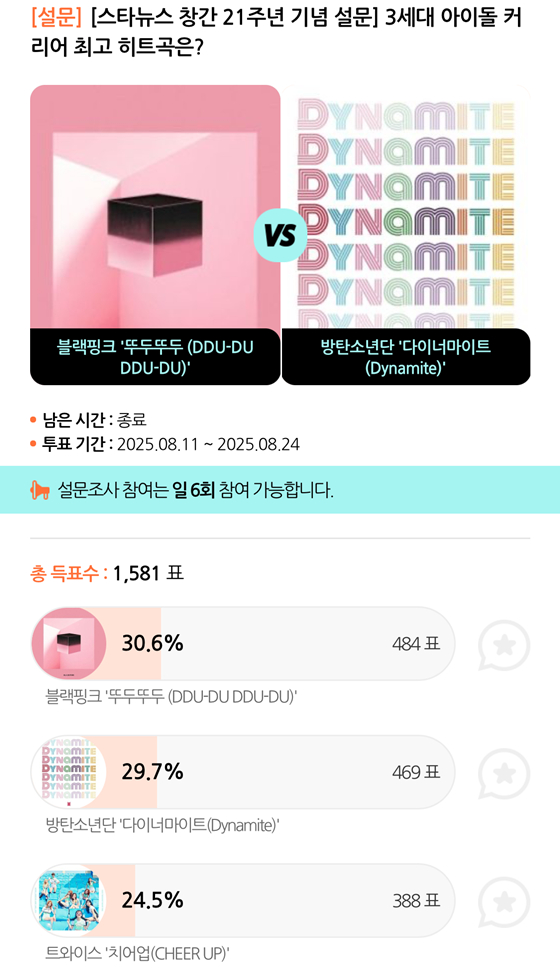 모바일 아티스트 종합 콘텐츠 앱 스타폴(STARPOLL)에서는 지난 11일부터 24일까지 '3세대 아이돌 커리어 최고 히트곡은?'이라는 주제로 설문 조사가 진행됐다. 이번 설문은 스타뉴스 창간 21주년을 기념해 열렸다.