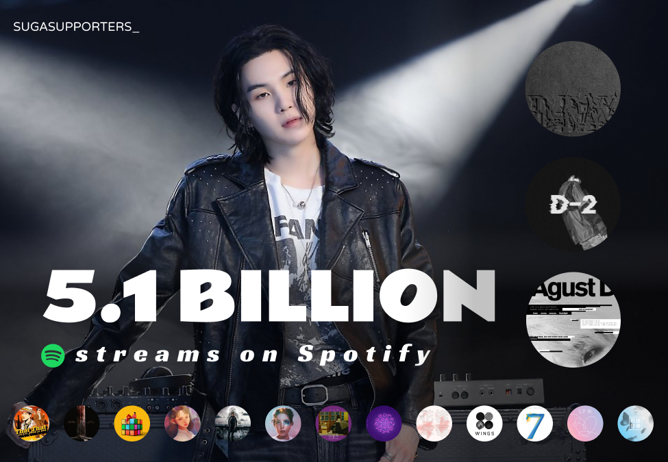 특히 2016년 발표한 첫 믹스테잎인 'Agust D'는 8월 초 5억 스트리밍을 달성했다. 이로써 슈가는 스포티파이에서 5억 스트리밍을 기록한 앨범을 3개 이상 보유한 최초이자 유일한 한국 솔로 아티스트로 자리매김했다. 아시아 솔로 아티스트 전체로 범위를 넓히면 조지(Joji), 미츠키(Mitsuki)에 이어 세 번째다.