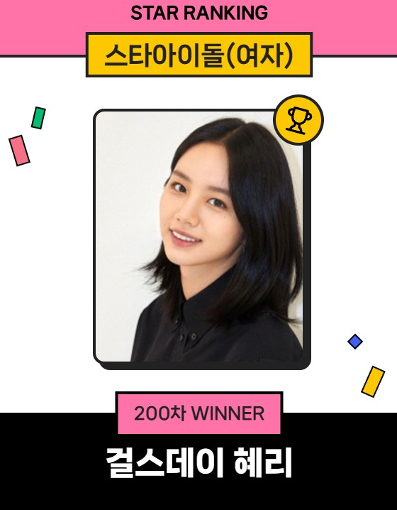 혜리는 지난 21일 오후 3시 1분부터 28일 오후 3시까지 진행된 8월 4주(200차) 스타랭킹 스타아이돌 여자 부문 랭킹 투표에서 2만833표를 획득하며 1위를 차지했다.
