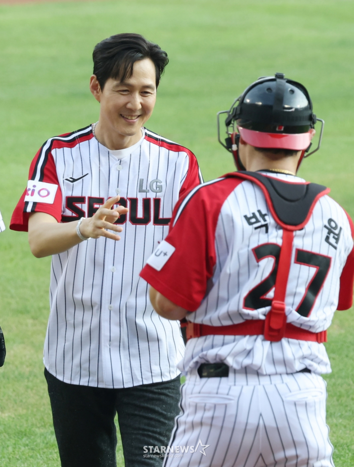 연예K-POP[포토] 이정재 '겨울에도 야구합시다'발행 : 2025.08.31 ・ 18:07수정 : 2025.08.31 ・ 22:02잠실=김진경 대기자2025 신한 SOL Bank KBO리그 LG 트윈스 대 키움 히어로즈 경기가 31일 서울 잠실야구장에서 열렸다.배우 이정재가 LG 승리기원 시구를 한 후 포수 박동원과 악수하고 있다.오징어게임 456번 성기훈으로 세계적 명성을 떨친 이정재는 20022년 프라임타임 에미상 드라마 시리즈부문 남우주연상을 수상했다.<저작권자 © 스타뉴스, 무단전재 및 재배포 금지>프로야구KBO시구승요승리요정치어리더추천 기사김진경 대기자기자홈좋아요 연예-K-POP의 인기 급상승 뉴스연예-K-POP의 최신 뉴스