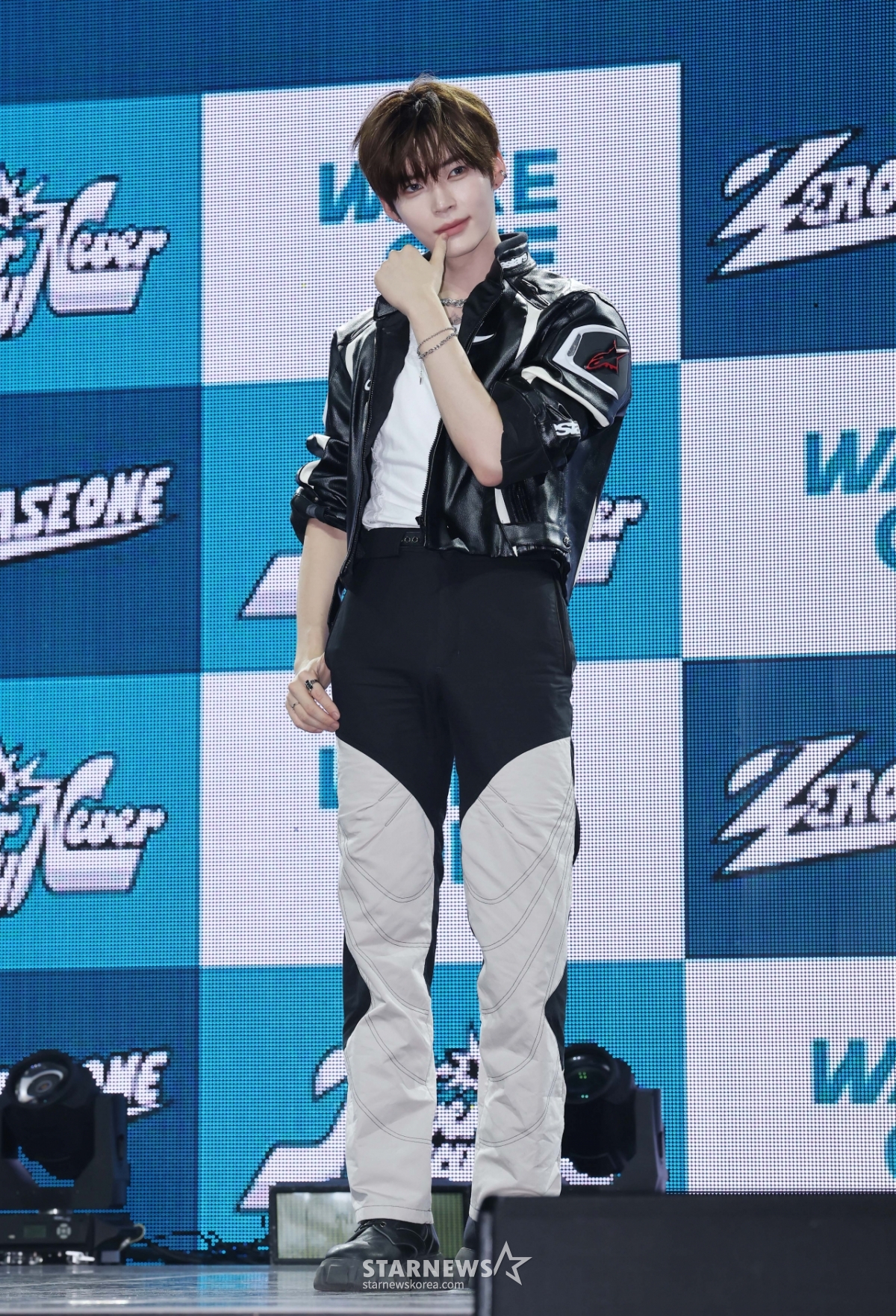 그룹 제로베이스원(ZEROBASEONE) 성한빈이 1일 오후 서울 용산구 블루스퀘어에서 진행된 정규 1집 '네버 세이 네버'(NEVER SAY NEVER) 발매기념 쇼케이스에서 포즈를 취하고 있다.