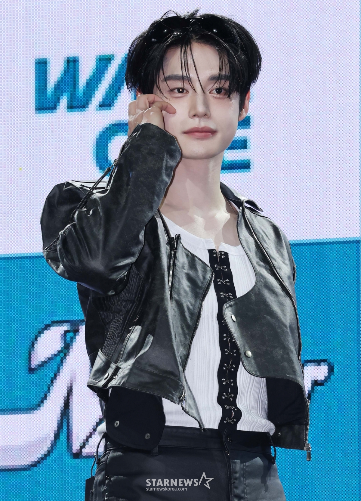그룹 제로베이스원(ZEROBASEONE) 김지웅이 1일 오후 서울 용산구 블루스퀘어에서 진행된 정규 1집 '네버 세이 네버'(NEVER SAY NEVER) 발매기념 쇼케이스에서 포즈를 취하고 있다.