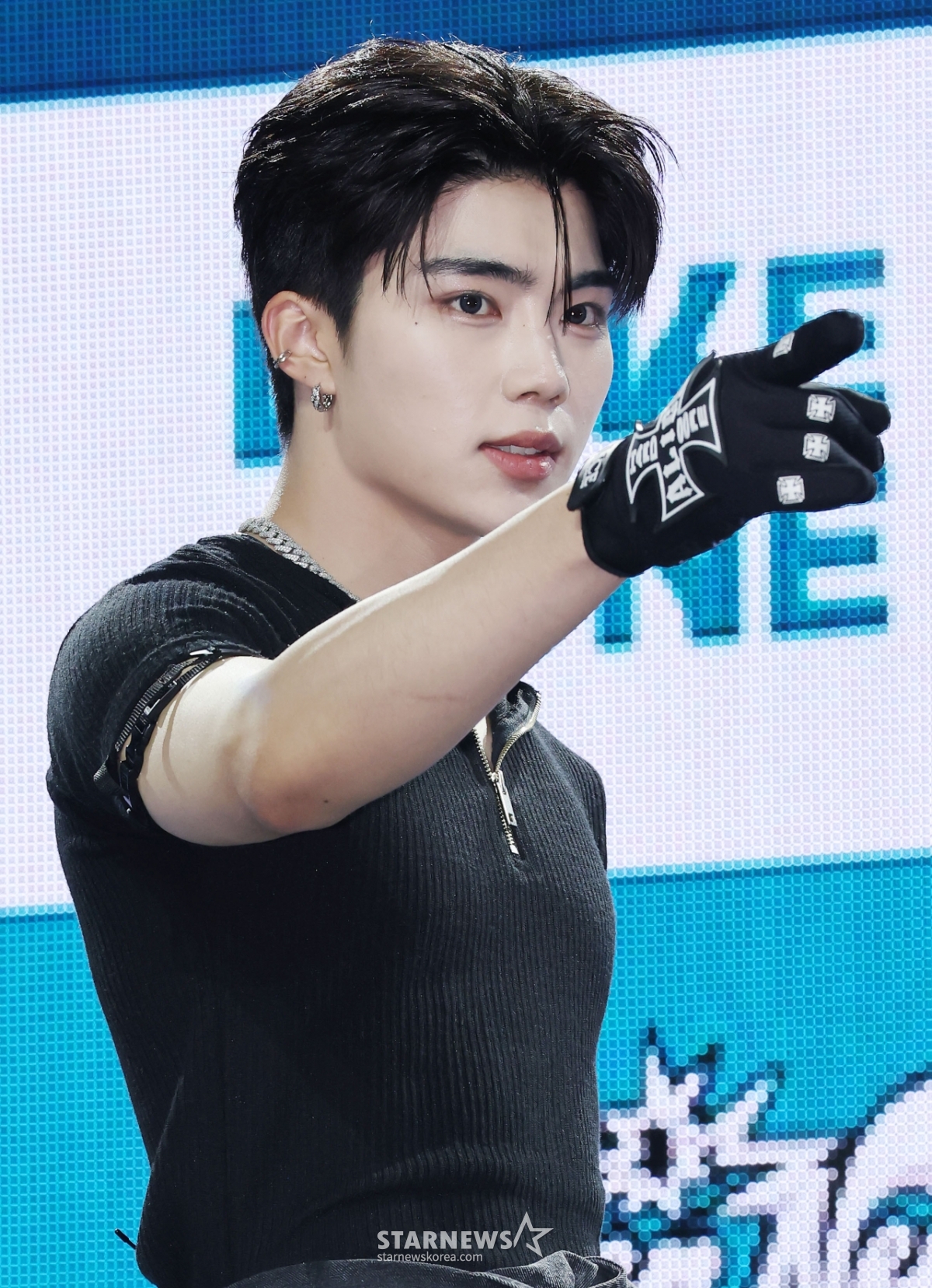 그룹 제로베이스원(ZEROBASEONE) 박건욱이 1일 오후 서울 용산구 블루스퀘어에서 진행된 정규 1집 '네버 세이 네버'(NEVER SAY NEVER) 발매기념 쇼케이스에서 포즈를 취하고 있다.