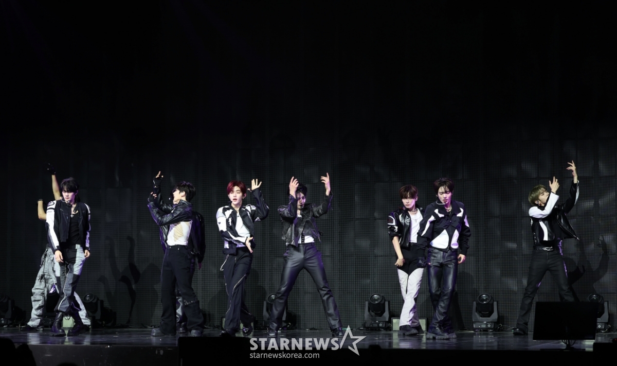 그룹 제로베이스원(ZEROBASEONE)이 1일 오후 서울 용산구 블루스퀘어에서 진행된 정규 1집 '네버 세이 네버'(NEVER SAY NEVER) 발매기념 쇼케이스에서 신곡을 선보이고 있다.