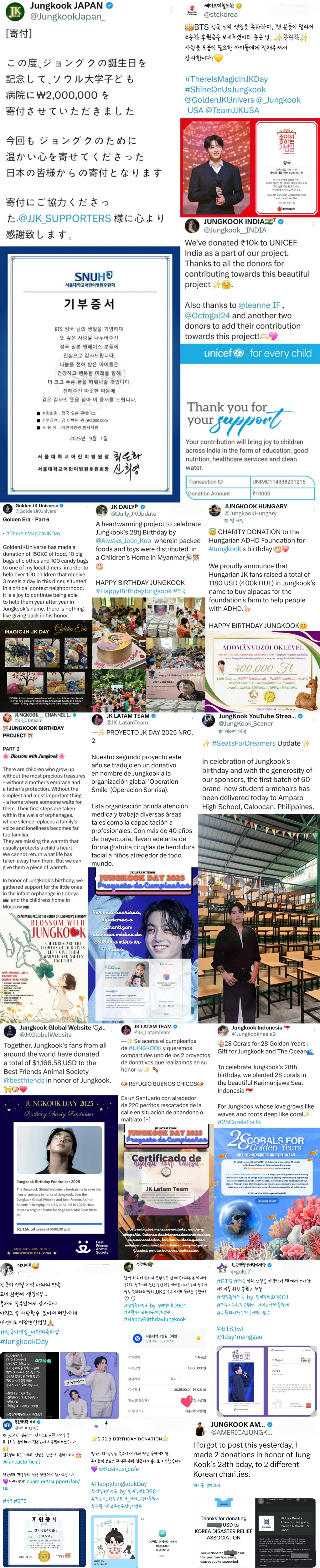 '골든 JK 유니버스', '정국 USA', '팀 JJK USA'는 세이브더칠드런에 100만 901원의 후원금을, '정국 인도'는 유니세프 인도 지부에 기부금을 보냈다. '골든 JK 유니버스'는 정국의 이름으로 어려운 환경에 처한 아이들을 돕기 위해 지역 식당에 음식 150Kg, 의류 봉지 10개, 사탕 봉지 100개를 전달했다.