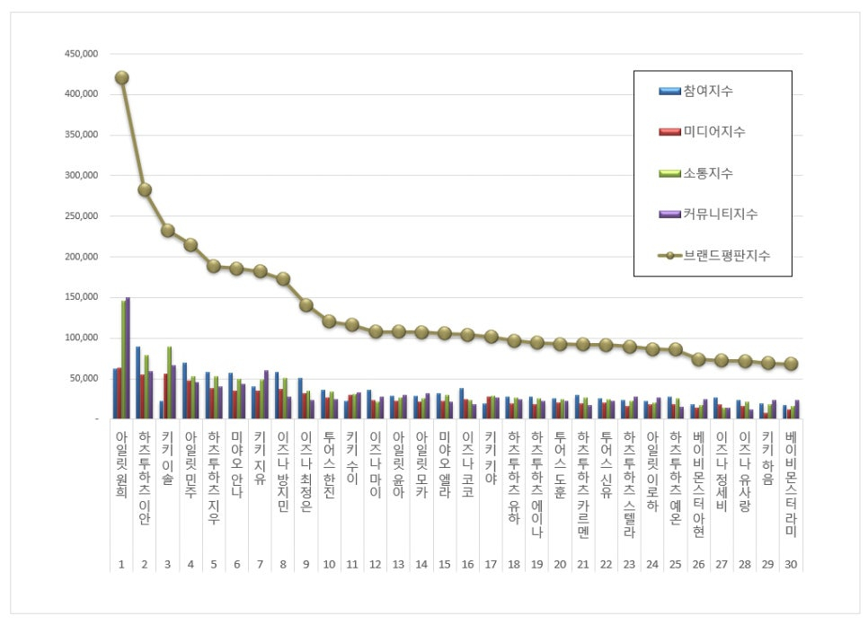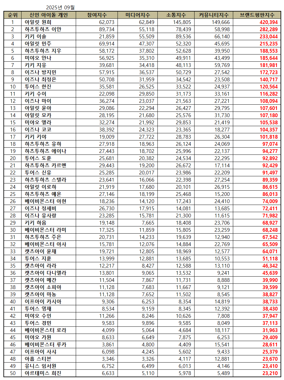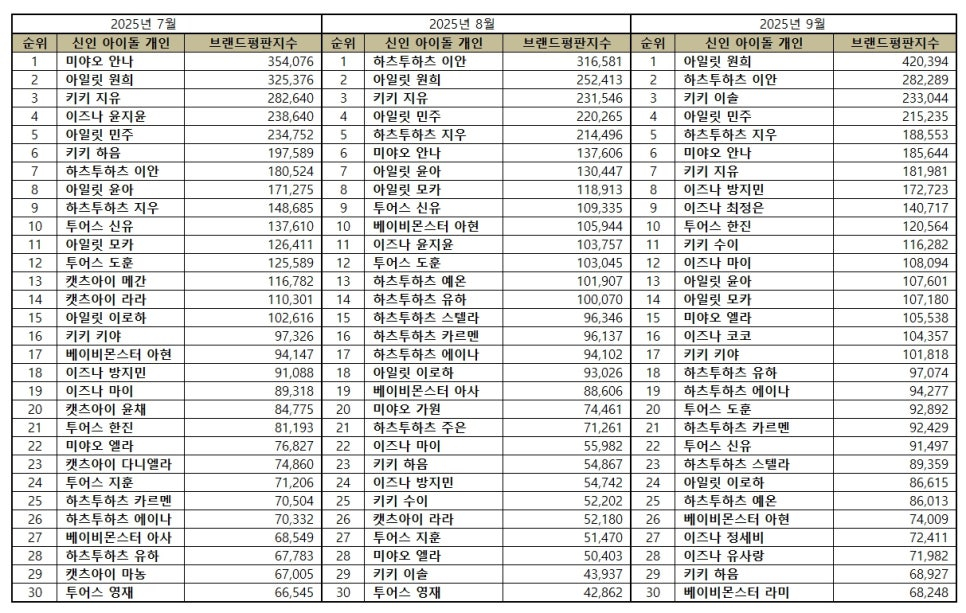 신인 아이돌 개인 브랜드평판 2025년 9월 분석에서는 아일릿 원희, 하츠투하츠 이안 , 키키 이솔, 아일릿 민주, 하츠투하츠 지우 , 미야오 안나, 키키 지유, 이즈나 방지민, 이즈나 최정은, 투어스 한진, 키키 수이, 이즈나 마이, 아일릿 윤아, 아일릿 모카, 미야오 엘라, 이즈나 코코, 키키 키야, 하츠투하츠 유하 , 하츠투하츠 에이나 , 투어스 도훈, 하츠투하츠 카르멘 , 투어스 신유, 하츠투하츠 스텔라 , 아일릿 이로하, 하츠투하츠 예온, 베이비몬스터 아현, 이즈나 정세비, 이즈나 유사랑, 키키 하음, 베이비몬스터 라미, 하츠투하츠 주은 , 베이비몬스터 아사, 캣츠아이 윤채, 투어스 지훈, 캣츠아이 라라, 캣츠아이 다니엘라, 캣츠아이 메간, 캣츠아이 소피아, 캣츠아이 마농, 이프아이 카시아, 투어스 영재, 미야오 수인, 투어스 경민, 베이비몬스터 로라, 미야오 가원, 베이비몬스터 루카, 이프아이 사샤, 아홉 스티븐 , 유니스 임서원, 아르테미스 희진를 분석했다.