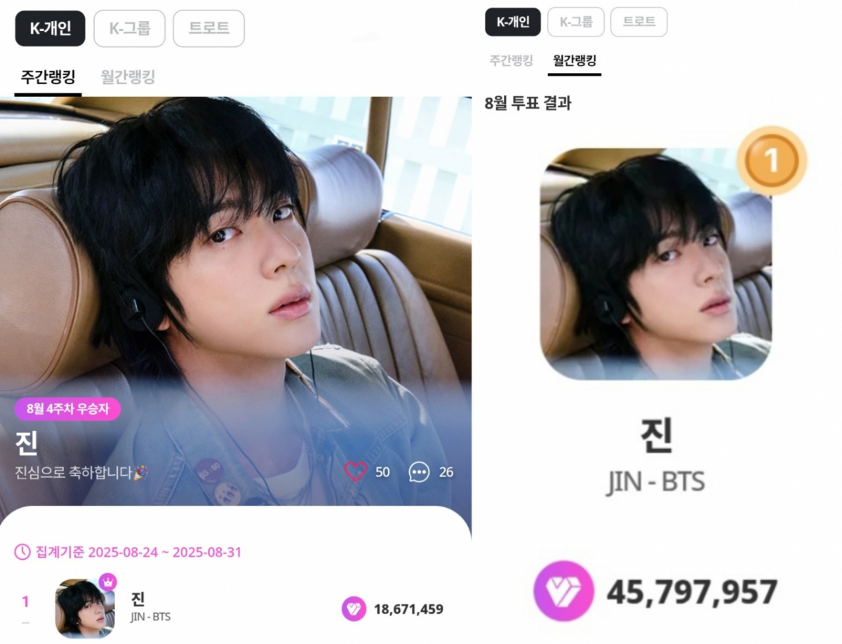 진은 마이원픽 'K-POP 개인 부문 주간랭킹' 8월 4주차(8월 24일~8월 31일) 투표에서 1867만 1459개의 하트를 얻어 압도적인 득표수로 1위에 올랐다.