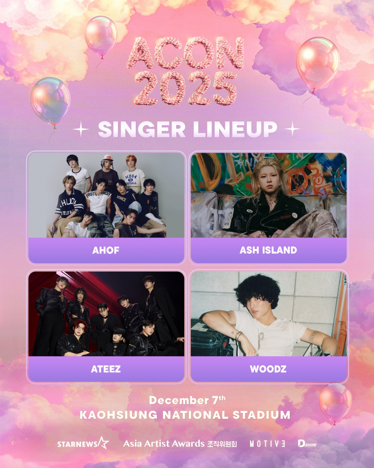 아홉(AHOF), 애쉬 아일랜드(Ash Island), 에이티즈(ATEEZ), 우즈(WOODZ), 최예나, 키스오브라이프(KISS OF LIFE), QWER(큐더블유이알)이 오는 12월 7일 가오슝 내셔널 스타디움에서 펼쳐지는 '10주년 아시아 아티스트 어워즈 2025(10th Anniversary Asia Artist Awards 2025, 이하 '10주년 AAA 2025')'의 페스타 'ACON 2025' 라인업에 합류했다.