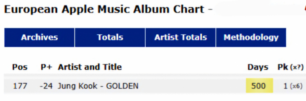 정국이 2023년 11월 발매한 첫 솔로 앨범 'GOLDEN'은 글로벌 음원 플랫폼 '애플 뮤직'(Apple Music) 유러피안(유럽) 앨범 차트에서 500일 진입을 기록했다.
