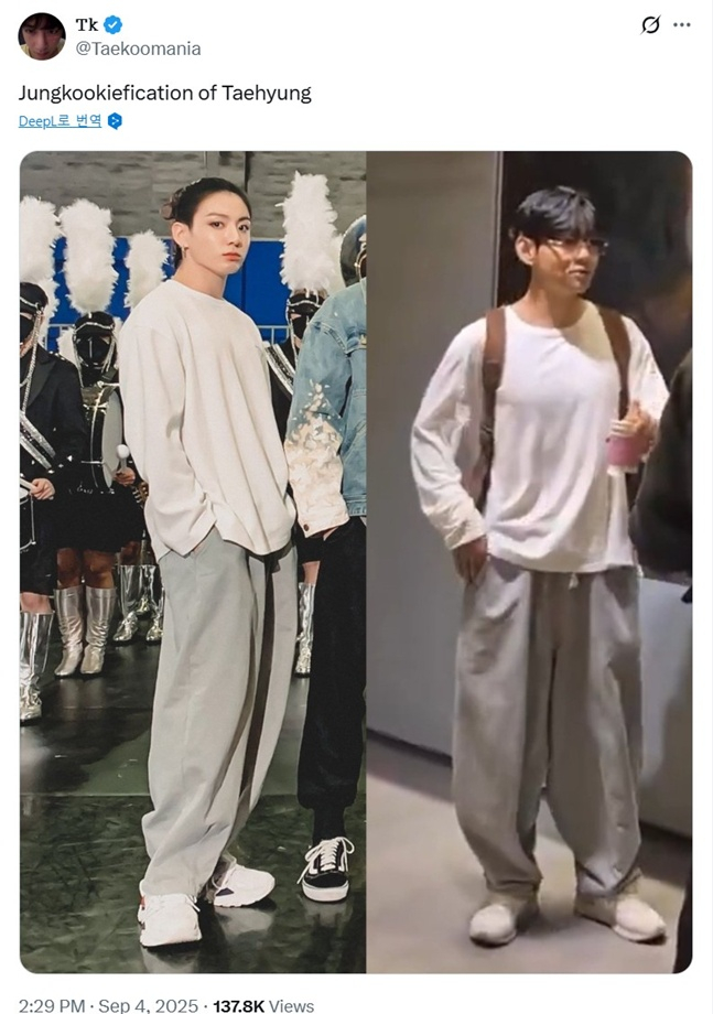 방탄소년단 뷔(태형)가 프리즈 서울 전시회를 관람하며 입은 패션이 몇년전 정국의 과거 스타일과 판박이라며 글로벌 팬들이 딱 집어냈다.