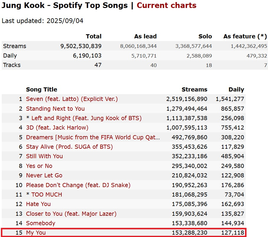 정국이 2022년 발매한 자작곡이자 팬송인 'My You'는 최근 세계 최대 음원 플랫폼 스포티파이(Spotify)에서 1억 5000만 스트리밍을 돌파했다.