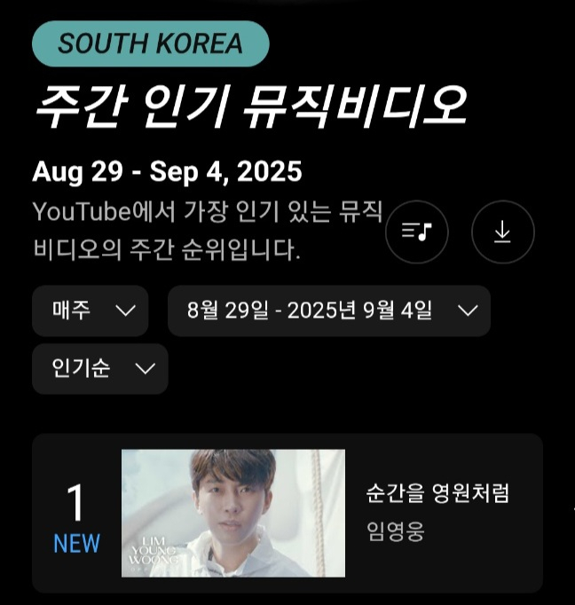 지난 8월 28일 공개된 임영웅 정규 2집 타이틀곡 '순간을 영원처럼' 뮤직비디오는 8월 29일~9월 4일 유튜브 한국 주간 인기 뮤직비디오 1위를 차지했다.