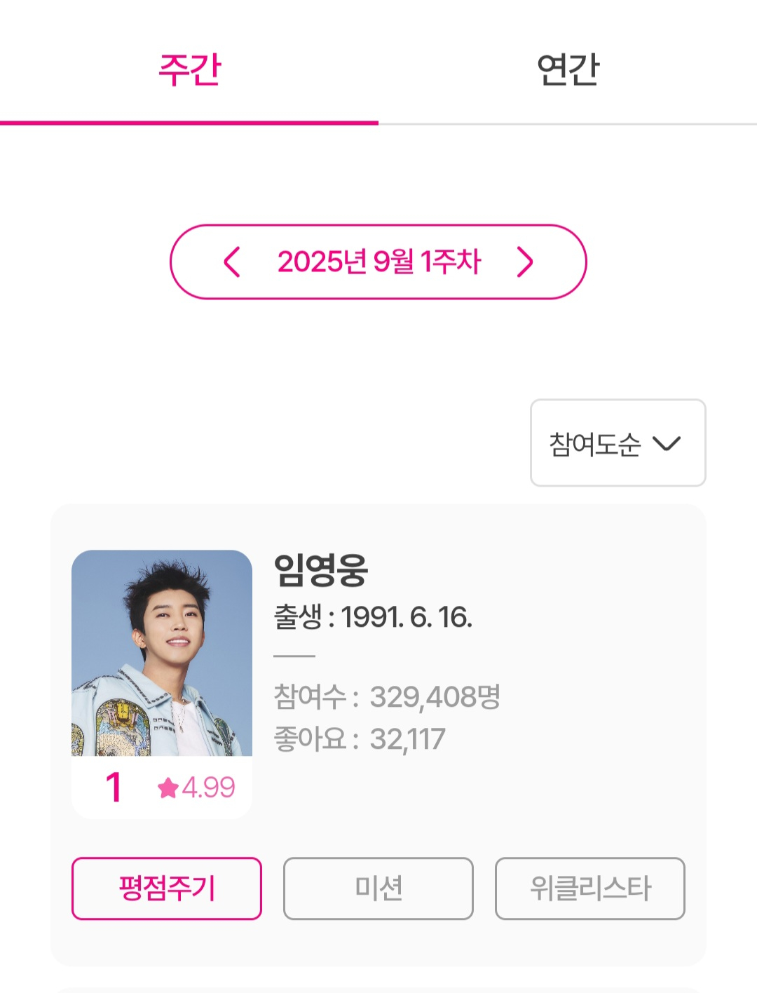 임영웅은 9월 1일부터 9월 7일까지 집계된 9월 1주차 아이돌차트 평점랭킹에서 32만 9408표를 얻어 1위를 차지했다.
