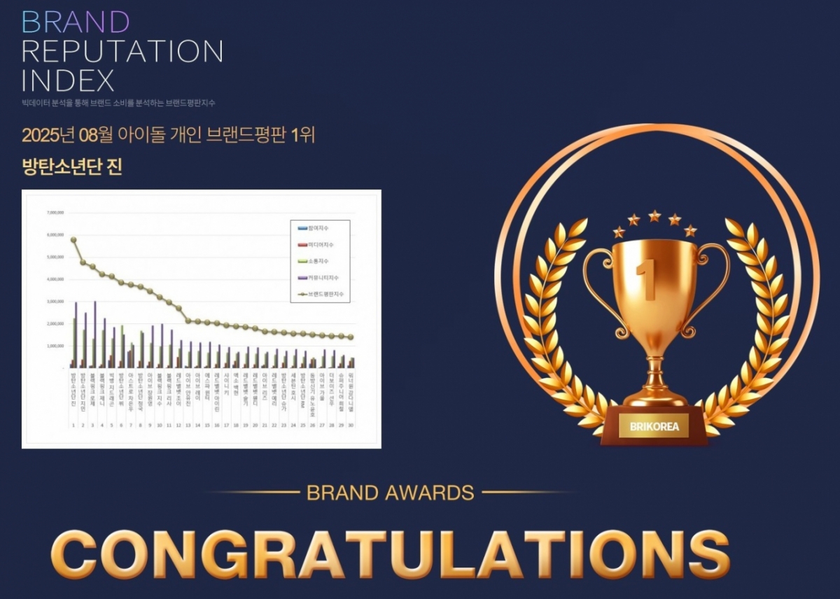 한국기업평판연구소는 2025년 7월 28일부터 8월 28일까지 1,730명 아이돌 개인 브랜드 빅데이터 129,698,562개를 추출하여 분석한 결과, 진이 아이돌 개인(남녀 통합) 브랜드평판에서 1위에 올랐다고 발표했다.