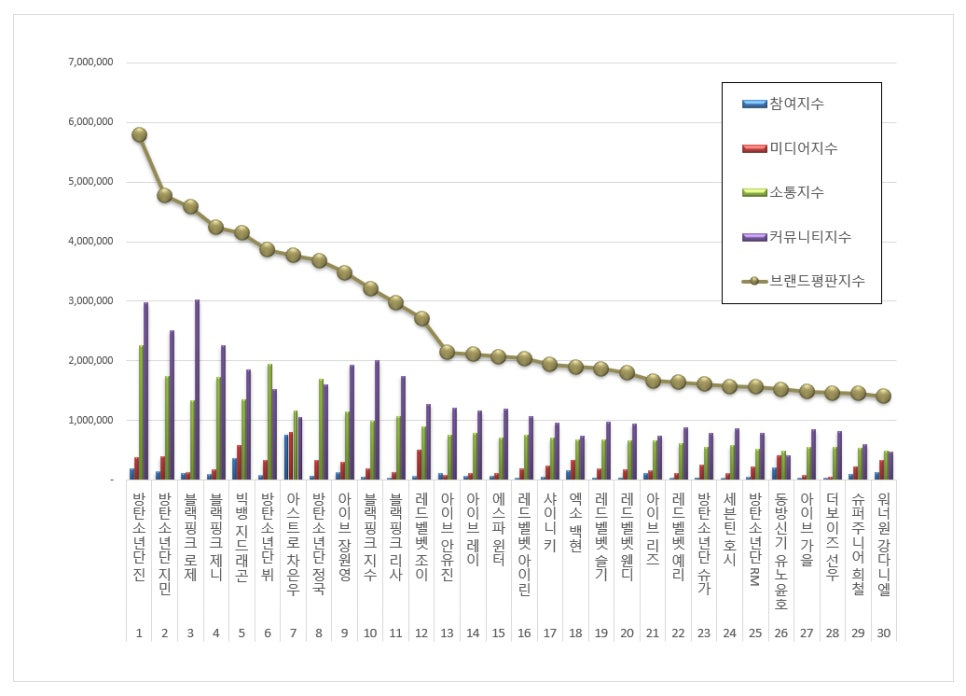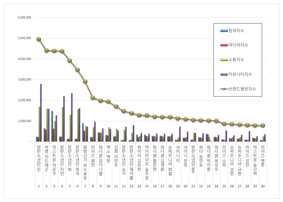 아이돌 개인 브랜드평판 1위에 오른 방탄소년단 진은 브랜드평판지수 5,786,723를 기록했다. 참여지수 193,207, 미디어지수 371,136, 소통지수 2,249,814, 커뮤니티지수 2,972,565으로 분석됐다.