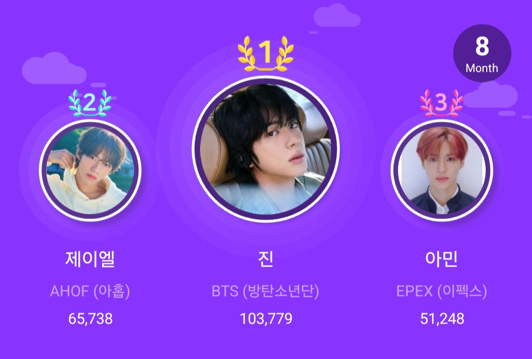 진은 지난 8월 1일부터 15일까지 글로벌 팬덤 플랫폼 스타 플래닛(STAR PLANET)에서 진행한 8월 아이돌 랭킹에서 10만 3779표를 얻어 압도적인 득표로 1위를 차지했다.