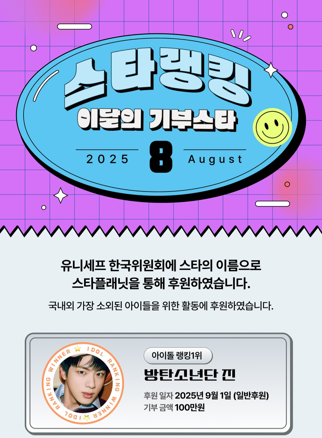 스타 플래닛은 8월 아이돌 랭킹 1위를 차지한 진의 이름으로 9월 1일 유니세프 한국위원회에 100만 원의 기부금을 전달했다고 밝혔다.