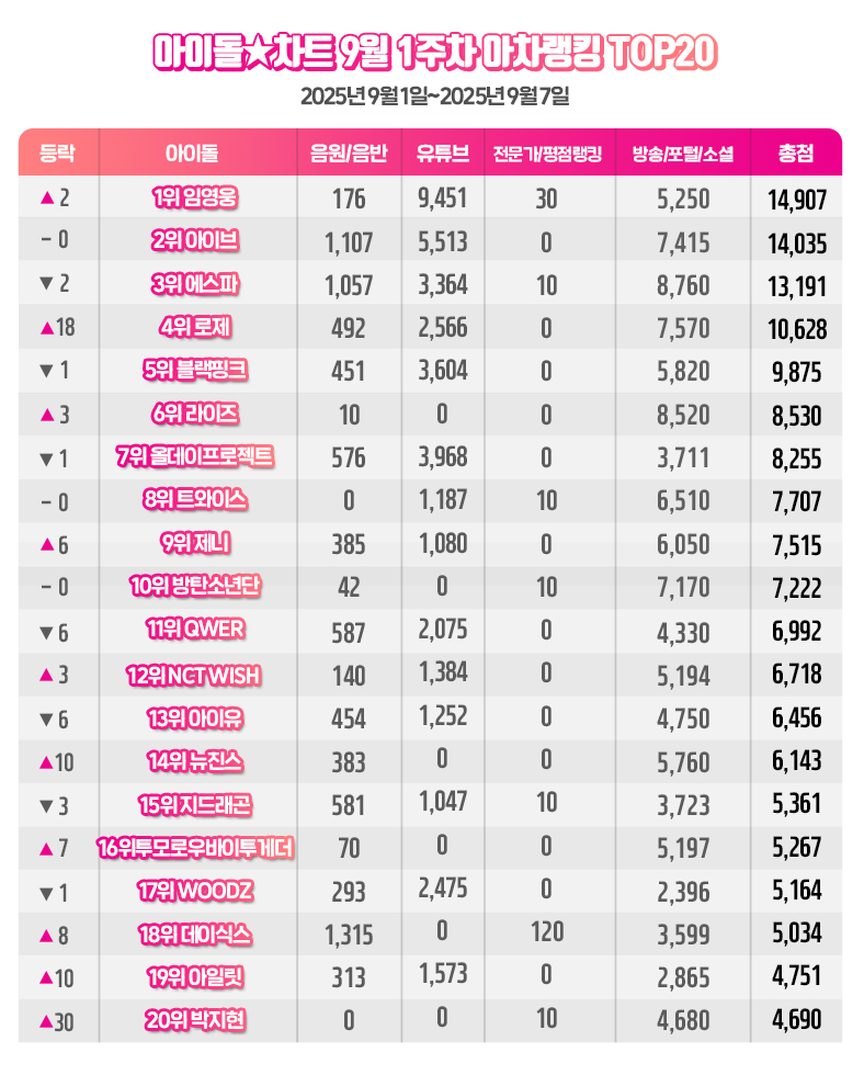 가수 임영웅이 9월 1주차 아이돌차트 아차랭킹 1위에 올랐다.