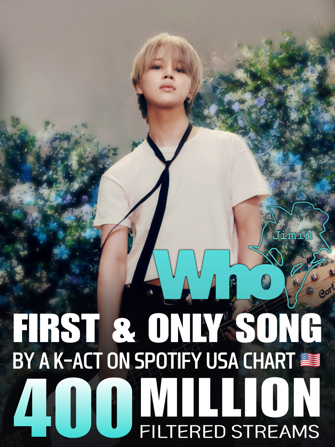 세계 최대 음원 스트리밍 플랫폼 스포티파이에 따르면 지민의 2집 'MUSE'(뮤즈) 타이틀곡 'Who'(후)가 스포티파이 미국 차트에서 총 4억 이상의 누적 스트리밍(필터링 후)을 달성했다.