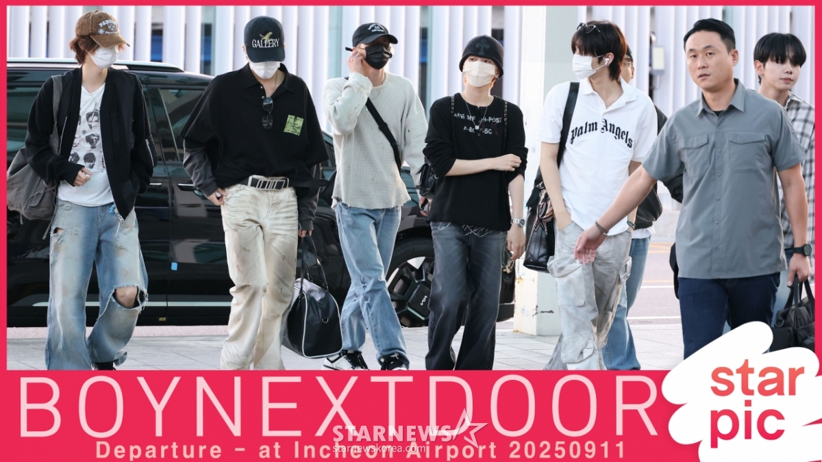 연예K-POP보이넥스트도어 '아침부터 힘하게!' [★영상]발행 : 2025.09.11 ・ 07:21인천국제공항=임성균 기자그룹 보이넥스트도어(BOYNEXTDOOR) 성호, 리우, 명재현, 태산, 이한, 운학이 해외 일정 차 11일 오전 인천국제공항을 통해 출국하고 있다. 2025.09.11<저작권자 © 스타뉴스, 무단전재 및 재배포 금지>공항패션출국보넥도보이넥스트도어성호리우추천 기사임성균 기자기자홈좋아요 연예-K-POP의 인기 급상승 뉴스연예-K-POP의 최신 뉴스