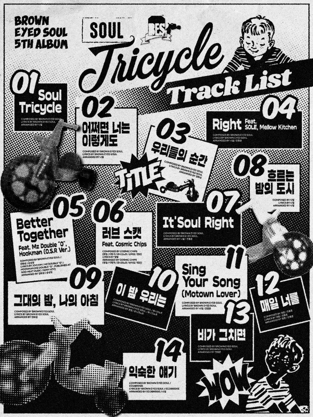 브라운아이드소울(정엽, 나얼, 영준)은 지난 10일 정규 5집 'Soul Tricycle(소울 트라이시클)'의 트랙리스트를 공개했다. 흑백 광고 포스터처럼 꾸며진 트랙리스트에는 이번 앨범의 오브제인 세발자전거를 비롯해 만화 캐릭터, 감각적인 폰트 디자인이 어우러져 브라운아이드소울이 사랑한 미국 R&B 소울의 감성이 물씬 느껴진다.