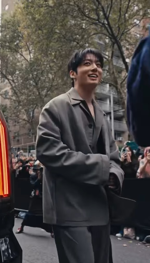 정국은 이날 캘빈클라인의 회색빛 카키색 오버사이즈 블레이저와 매칭 셔츠, 하이웨이스트 와이드 팬츠, 피티드 베스트로 구성된 정장 룩을 선보였다. 실버 펜던트 체인, 양쪽 귀와 입술의 피어싱, 검은색 가죽 힐 부츠로 스타일링을 완성해 군복무 이전의 세련된 모습을 되찾았다.