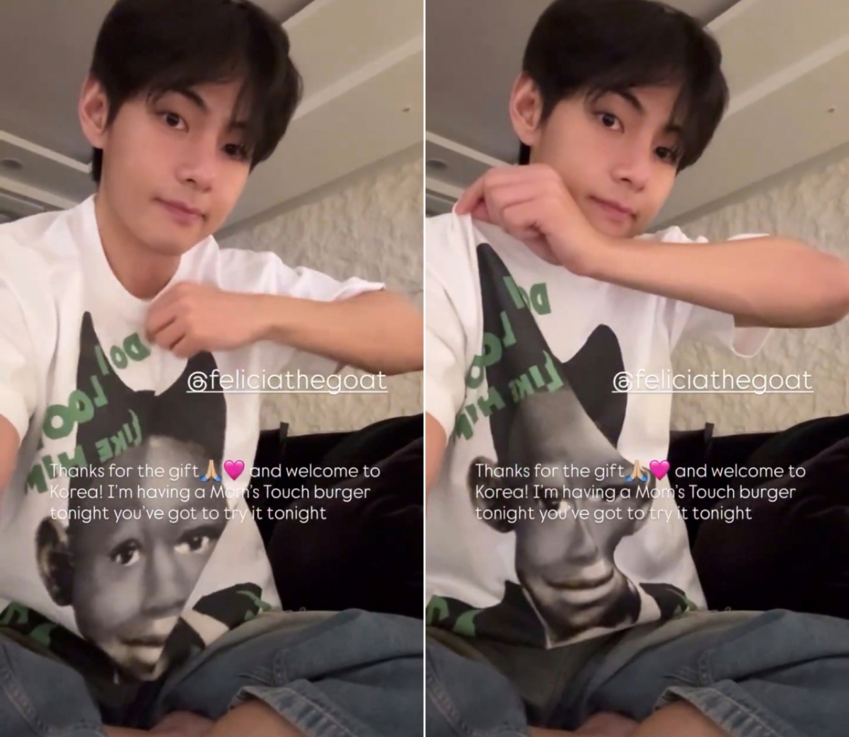 뷔가 햄버거 사진을 올린 이유는 타일러가 공연 중 한국 팬들에게 "오늘 점심으로 맘스터치 에드워드리 세트를 먹었다. 이런 맛있는 것을 당신들만 먹었냐"며 공연 내내 '마마스터치'를 외치며 한국 햄버거에 흠뻑 빠진 모습을 보여 큰 웃음을 안겼기 때문이다. 타일러가 연신 한국 햄버거 사랑을 외치는 것을 본 뷔가 크게 웃는 모습이 관객의 카메라에 포착됐다. 뷔는 몇 년 전 해당 브랜드의 햄버거를 자주 먹는다고 팬들에게 말한 바 있다.