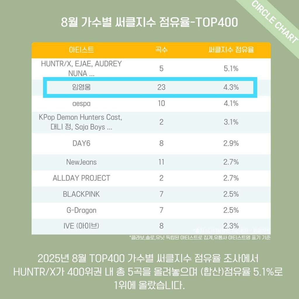 1위는 넷플릭스 '케이팝 데몬 헌터스'로 전 세계적 사랑을 받고 있는 헌트릭스(HUNTR/X) 5.1%(5곡)이었으며 2위 임영웅에 이어 3위 에스파 4.1%(10곡) 순이었다.