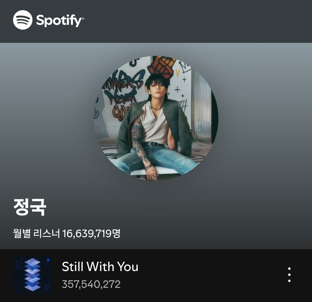 방탄소년단(BTS) 정국의 'Still With You'(스틸 위드 유)가 세계 최대 음원 플랫폼 스포티파이(Spotify)에서 또 하나의 눈부신 기록을 썼다.