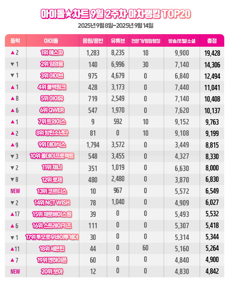 임영웅은 아이돌차트 9월 2주차(9월 8일~9월 14일) 아차랭킹에서 음원 점수 140점, 유튜브 점수 6996점, 소셜 점수 7140점 등 총점 1만 4306점으로 2위를 기록했다.