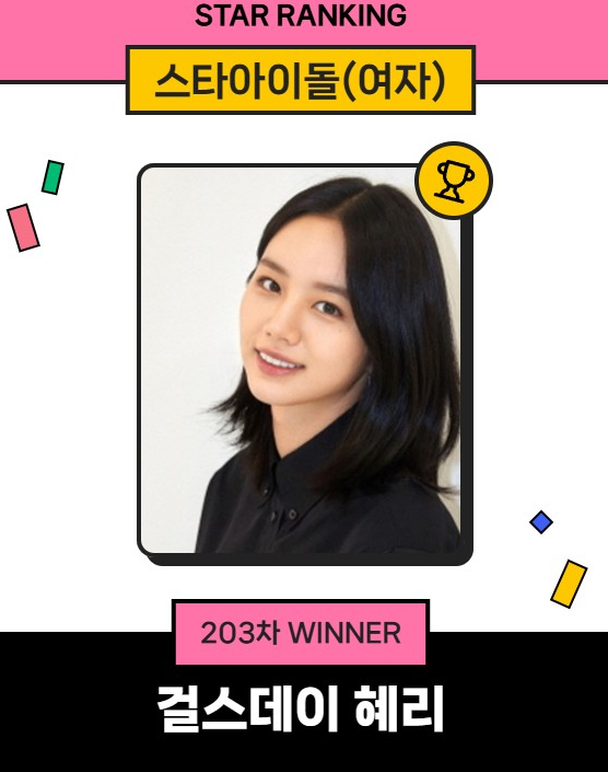 혜리는 지난 11일 오후 3시 1분부터 18일 오후 3시까지 진행된 203차 스타랭킹 스타아이돌 여자 부문 랭킹 투표에서 2만2300표를 획득하며 20주 연속 1위를 지켰다.