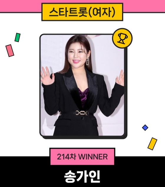 송가인은 지난 11일 오후 3시 1분부터 18일 오후 3시까지 진행된 214차 스타랭킹 스타트롯 여자 랭킹 투표에서 5만 8464표를 획득하며 1위를 차지했다.